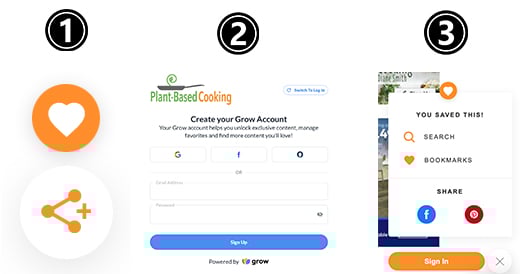 Grow helps you create your own personal account so you can build a library of saved recipes right here on PlantBasedCooking.com (and on any other site that uses Grow, too!). Once you’re signed in, you can: